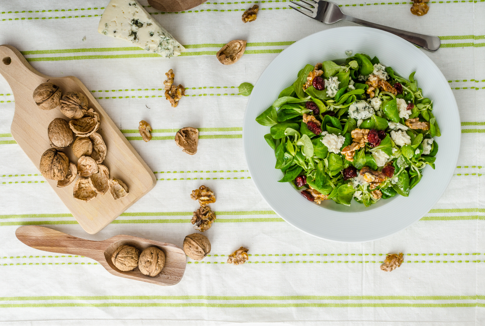 חסה טרייה מתפנקת עם צנוניות, בצל ירוק, גבינת פטה עיזים ואגוזי מלך ברוטב שמנת חמוצה