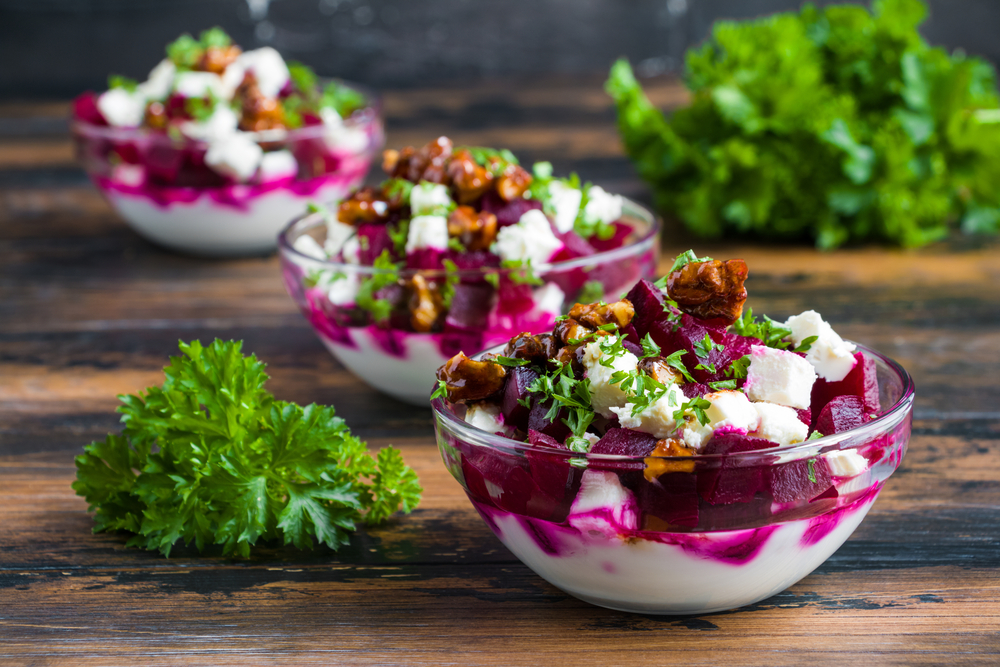 סלקים במרינדת סילאן-לימון מוגשים על בסיס יוגורט עיזים, שקדים ועשבי תיבול טריים