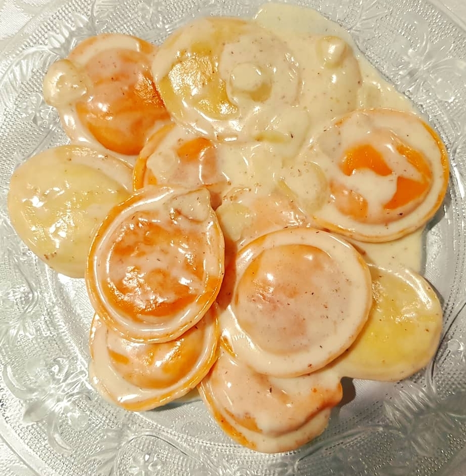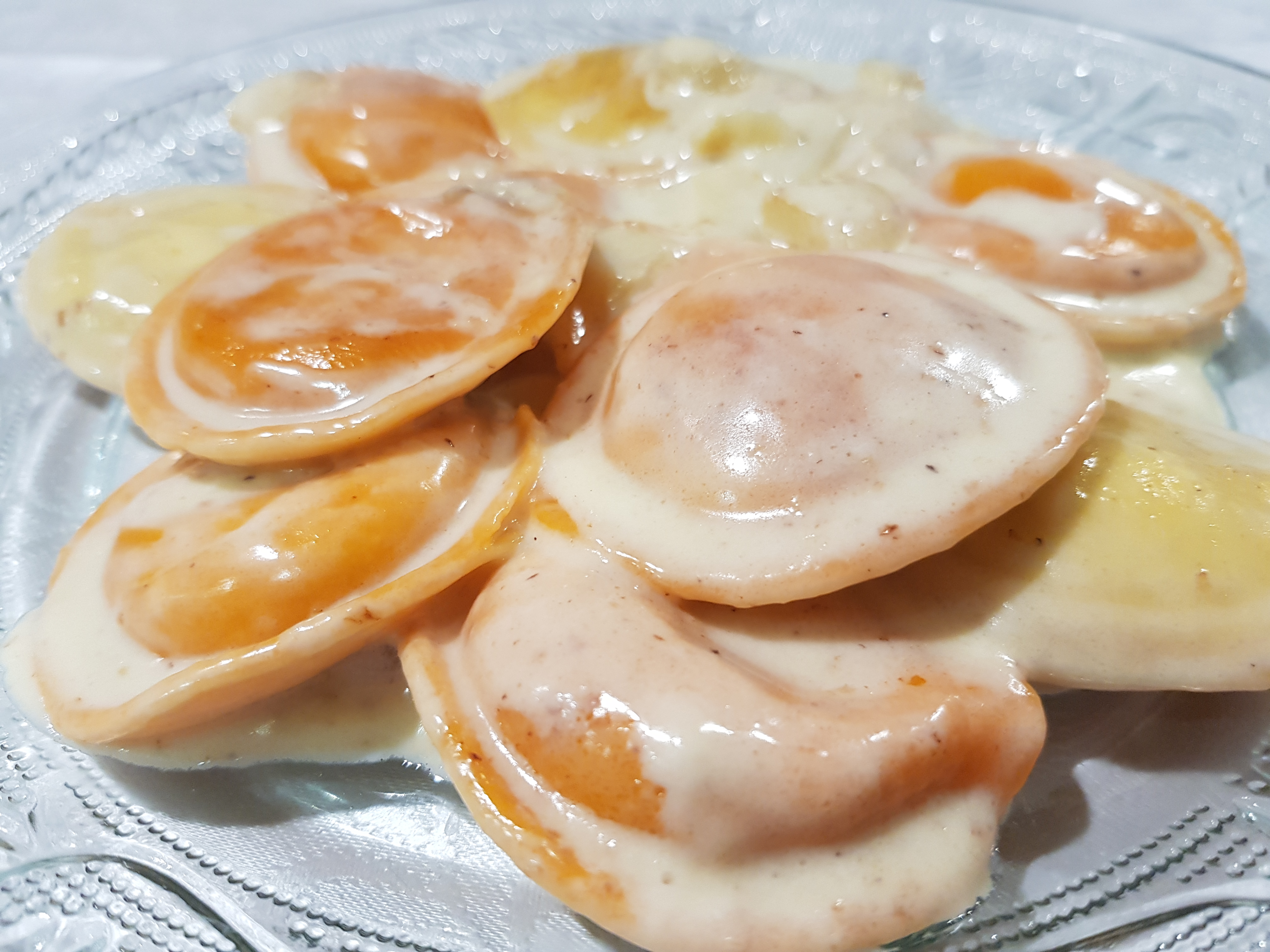 רביולי טרי המורכב מבצק עשוי קמח דורום איטלקי וביצים טריות מפוסטרות ומלית קרם בטטות צלויות בתנור עד לקרמליזציה וריכוך ומעורבבות עם גבינות ליצירת קרם מופלא