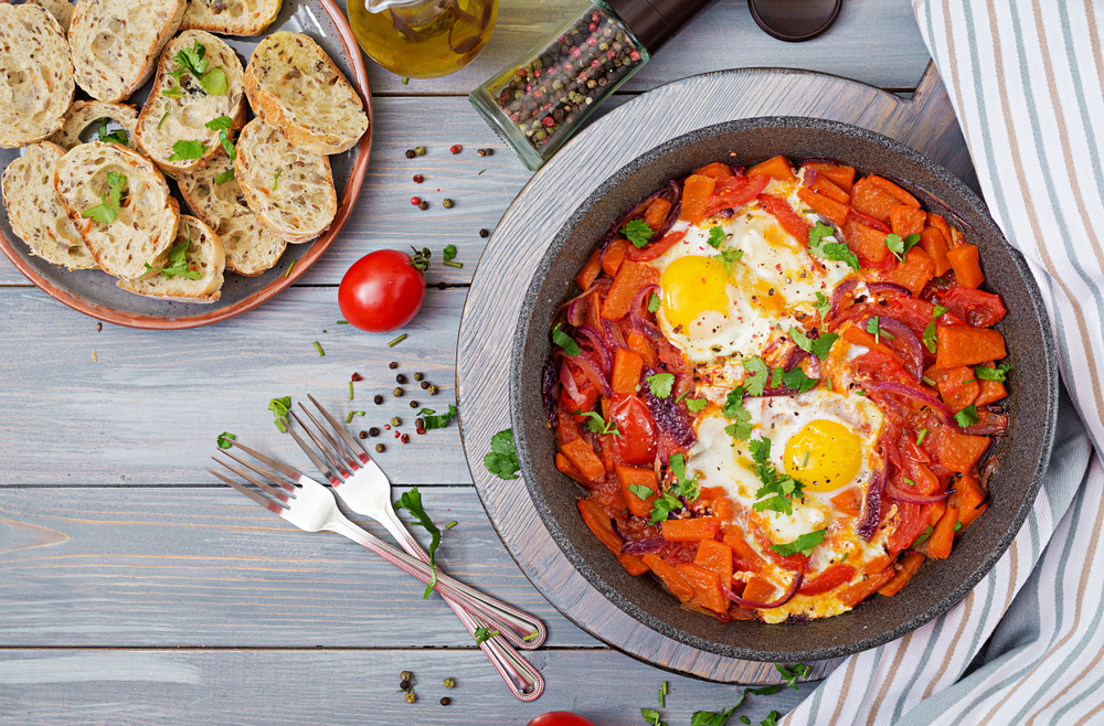 שקשוקת דלעת ייחודית ומפנקת מוגשת עם פלפלים, בצלים, 8 ביצים ולחם פרנה מפנק